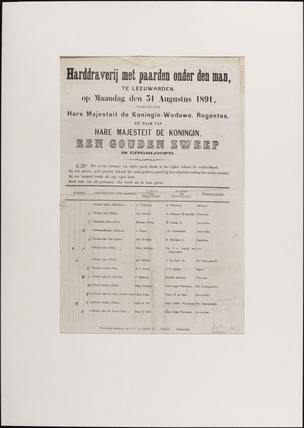 Harddraverij met paarden onder den man, te Leeuwarden, op maandag den 31 augustus 1891, waarvoor door Hare Majesteit de Koningin-Weduwe, Regentes, uit naam van Hare Majesteit de Koningin, een gouden zweep is uitgeloofd