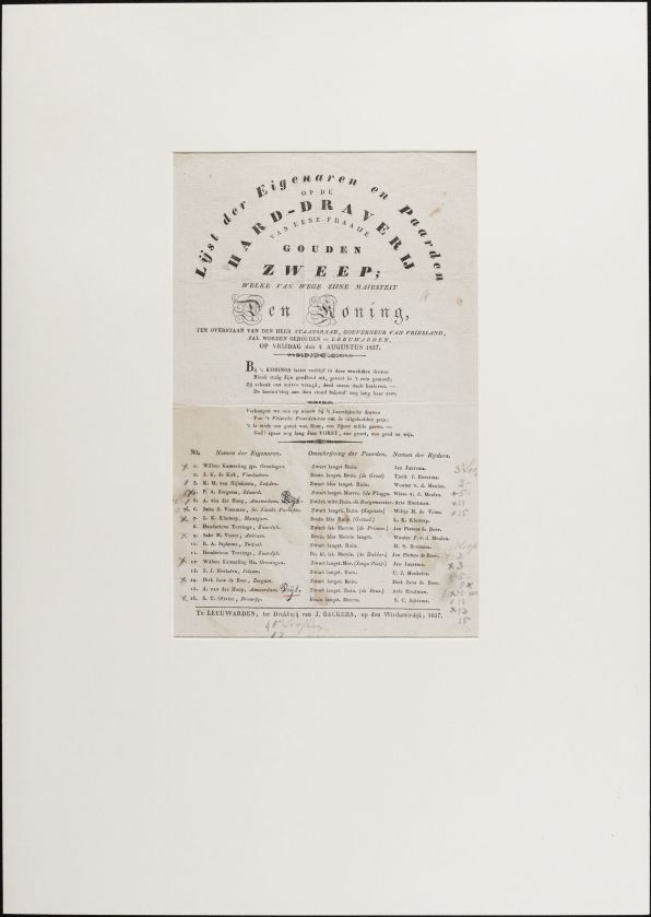 Lijst der eigenaren en paarden op de hard-draverij van eene fraaije gouden zweep; welke van wege Zijne Majesteit den Koning [...] zal worden gehouden te Leeuwarden, op vrijdag den 4 augustus 1837