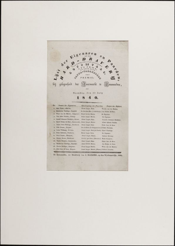 Lijst der eigenaren en paarden op de hard-draverij van eene fraaije zilveren koffijvaas [...] bij gelegenheid der jaarmarkt te Leeuwarden, op maandag den 13 julij 1840