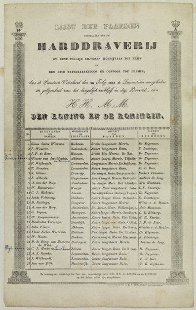 Lijst der paarden toegelaten tot de harddraverij om eene fraaije zilveren koffijvaas tot prijs [...] den 22 julij 1841 [...]