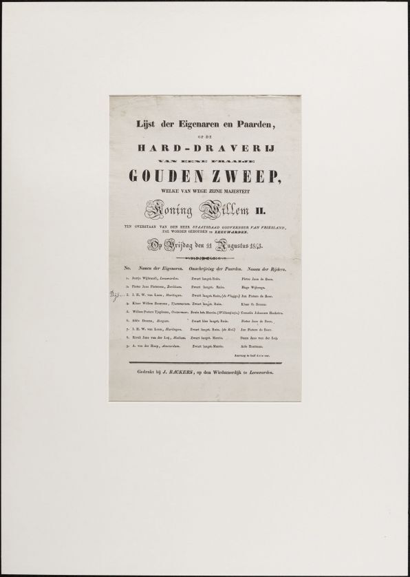 Lijst der eigenaren en paarden op de hard-draverij van eene fraaije gouden zweep welke van Zijne Majesteit Koning Willem II [...] zal worden gehouden te Leeuwarden op vrijdag den 11 augustus 1843