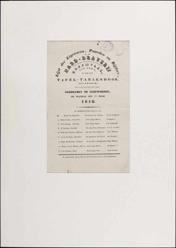 Lijst der eigenaren, paarden en rijders op de hard-draverij van eene fraaije zilveren koffijvaas [...] bij gelegenheid der jaarmarkt te Leeuwarden op maandag den 13 julij 1846