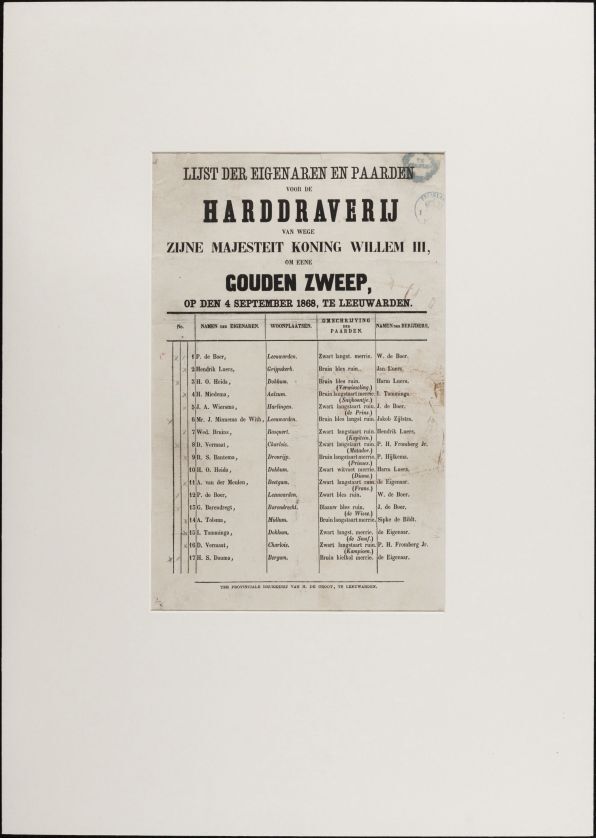 Lijst der eigenaren en paarden voor de harddraverij van wege Zijne Majesteit Koning Willem III om eene gouden zweep p den 4 september 1868 te Leeuwarden