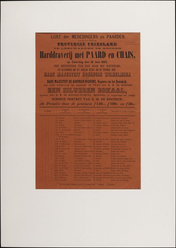 Lijst der mededingers en paarden tot de van wege de provincie Friesland te Leeuwarden te houden harddraverij met paard en chais, op zaterdag den 18 juni 1892, den gedenkdag van den slag bij Waterloo, ter gelegenheid van het heuglijk bezoek aan de provincie door Hare Majesteit Koningin Wilhelmina [...] een zilveren bokaal [...]