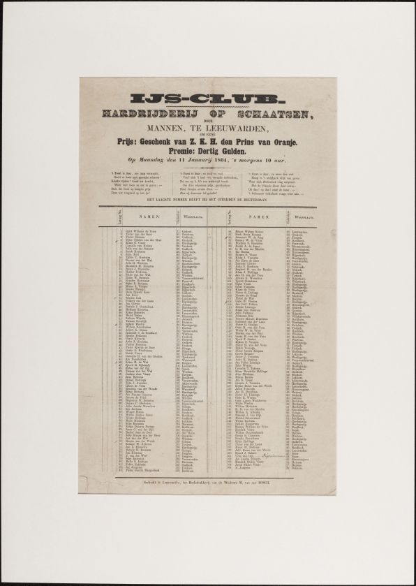 IJsclub. Hardrijderij op schaatsen door mannen te Leeuwarden om eene prijs: geschenk van Z.K.H. den Prins van Oranje. Premie: dertig gulden op maandag den 11 januarij 1864