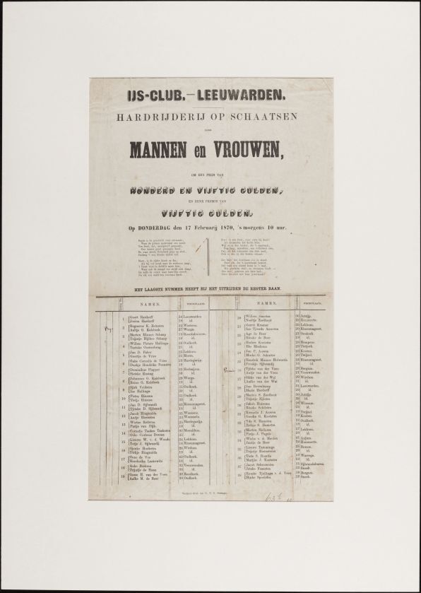 IJsclub te Leeuwarden. Hardrijderij op schaatsen door mannen en vrouwen om een prijs van honderd en vijftig gulden en eene premie van vijftig gulden op donderdag den 17 februarij 1870