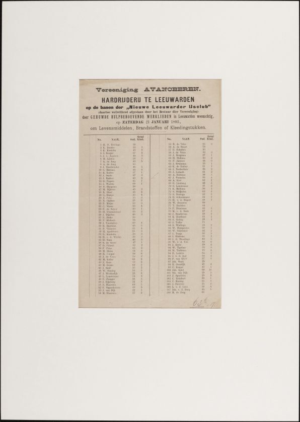 Hardrijderij te Leeuwarden op de banen der "Nieuwe Leeuwarder IJsclub" [...] door gehuwde hulpbehoevende werklieden [...] op zaterdag 21 januari 1893 om levensmiddelen, brandstoffen en kleedingstukken