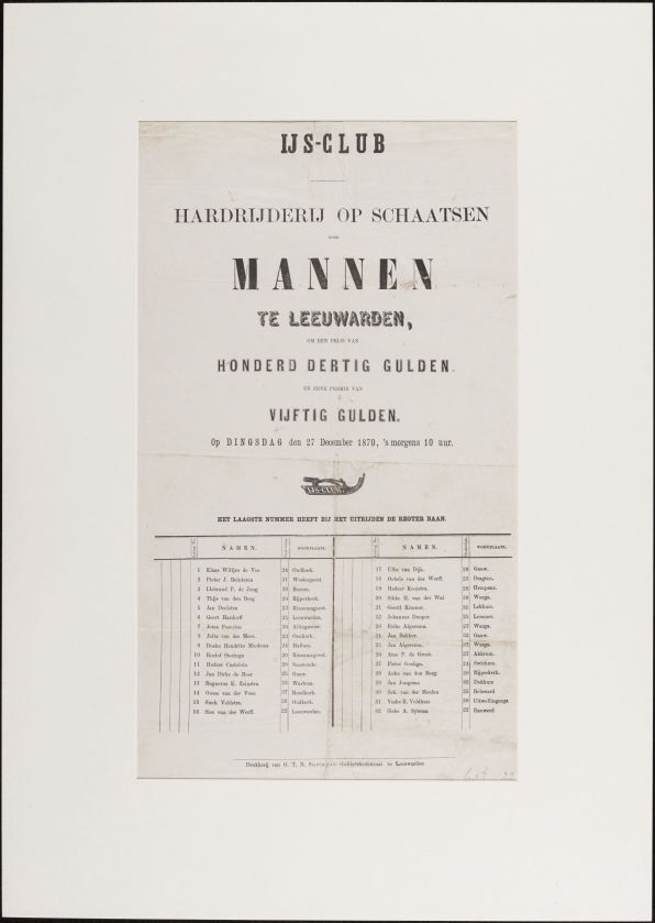 IJsclub hardrijderij op schaatsen door mannen te Leeuwarden om een prijs van honderd dertig gulden en eene premie van vijftig gulden op dingsdag den 27 december 1870