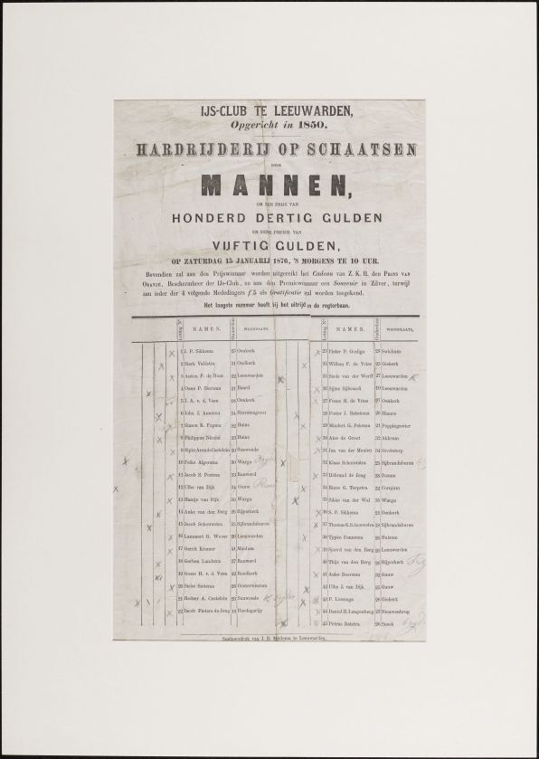 IJsclub te Leeuwarden. Hardrijderij op schaatsen door mannen om een prijs van honderd dertig gulden en eene premie van vijftig gulden op zaturdag 15 januarij 1876