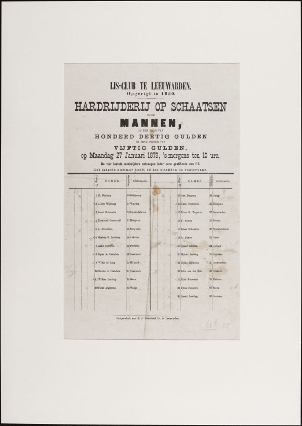 IJsclub te Leeuwarden. Hardrijderij op schaatsen door mannen om een prijs van honderd dertig gulden en eene premie van vijftig gulden op maandag 27 januari 1879