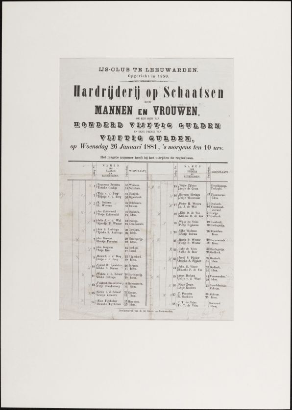 IJsclub te Leeuwarden. Hardrijderij op schaatsen door mannen en vrouwen om een prijs van honderd vijftig gulden en eene premie van vijftig gulden op woensdag 26 januari 1881