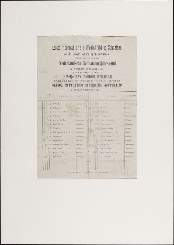 Eerste internationale wedstrijd op schaatsen op de Groote Wielen bij Leeuwarden uigeschreven door het Nederlandsche schaatsenrijdersbond op woensdag 28 januarij 1885