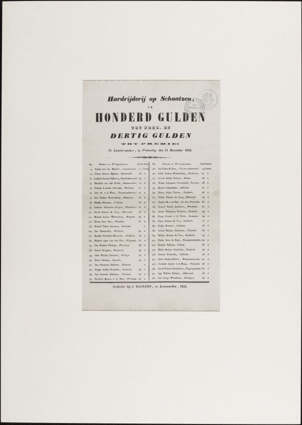 Hardrijderij op schaatzen om honderd gulden tot prijs en dertig gulden tot premie te Leeuwarden op woensdag den 11 december 1844