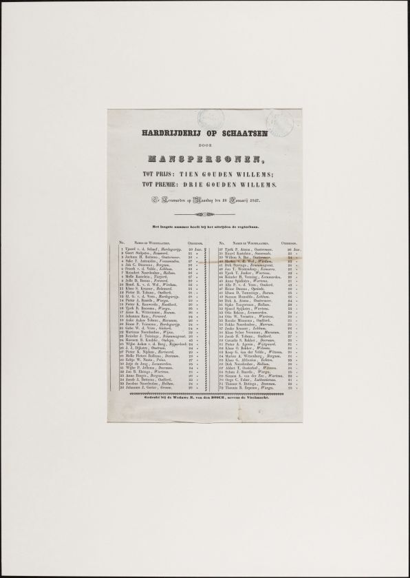 Hardrijderij op schaatsen door manspersonen te Leeuwarden op maandag den 18 januarij 1847