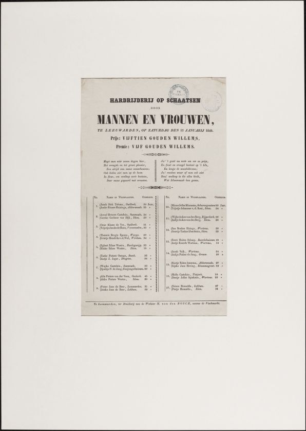 Hardrijderij op schaatsen door mannen en vrouwen te Leeuwarden op zaturdag den 13 januarij 1849