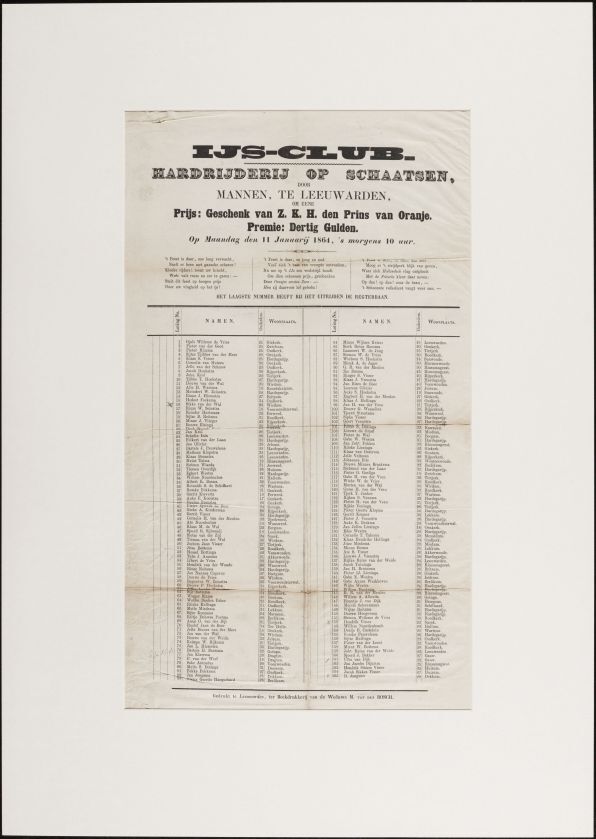 IJsclub. Hardrijderij op schaatsen door mannen te Leeuwarden om eene prijs: geschenk van Z.K.H. den Prins van Oranje. Premie: dertig gulden op maandag den 11 januarij 1864