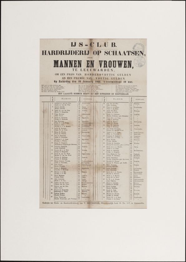 IJsclub. Hardrijderij op schaatsen door mannen en vrouwen te Leeuwarden om een prijs van honderd dertig gulden en eene premie van vijftig gulden op zaturdag den 16 januarij 1864