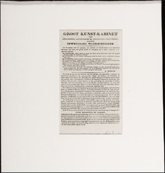 Advertentie voor het Groot Kunst-Kabinet van Mechanische, Arcobatische en Anatomische Voorwerpen, alsmede Beweegbare Wassen-Beelden, op de kermis te Leeuwarden (opgevouwen blad)