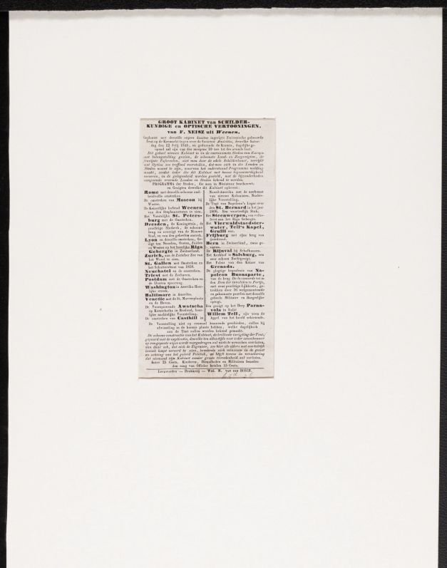 Advertentie voor het Groot Kabinet van Schilderkundige en Optische Vertooningen van F. Niesz uit Weenen, op de kermis te Leeuwarden