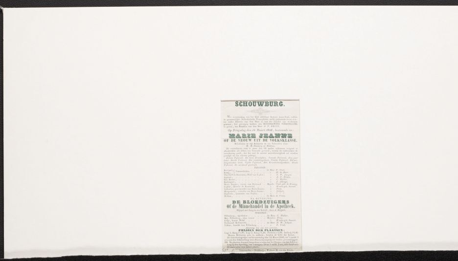 Programma van de opvoering van de stukken Marie Jeanne De Bloedzuigers op 14 maart 1848 in de Schouwburg te Leeuwarden