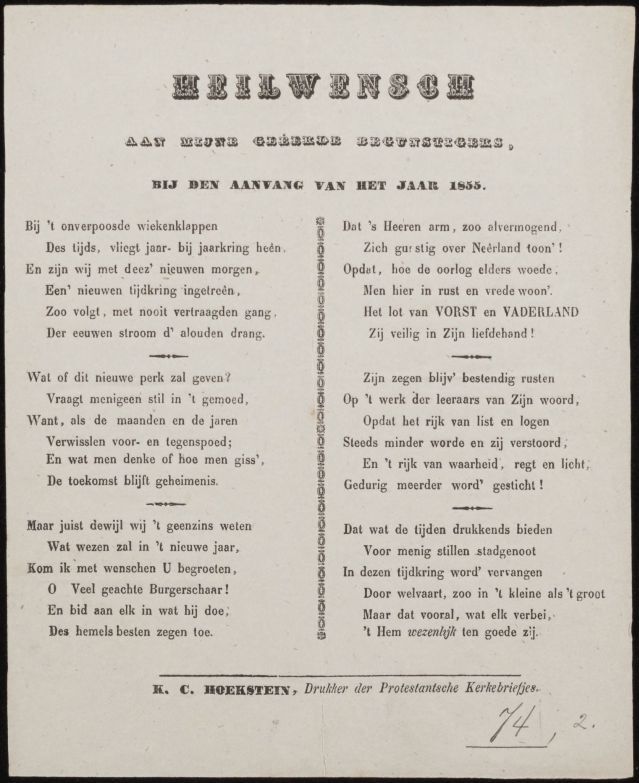 Nieuwjaarswens van K.C. Hoekstein, Drukker der Protestansche Kerkbriefjes, voor het jaar 1855
