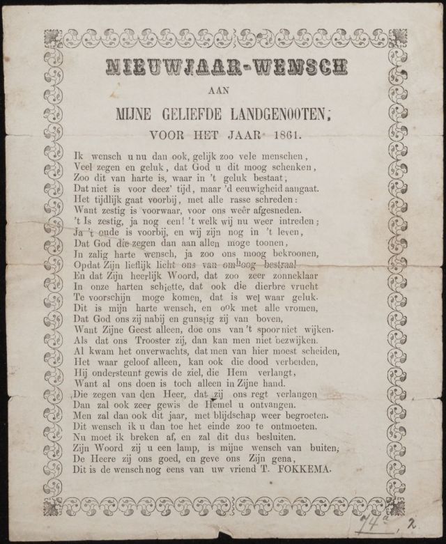Nieuwjaarswens van T. Klaas Fokkema, voor het jaar 1861