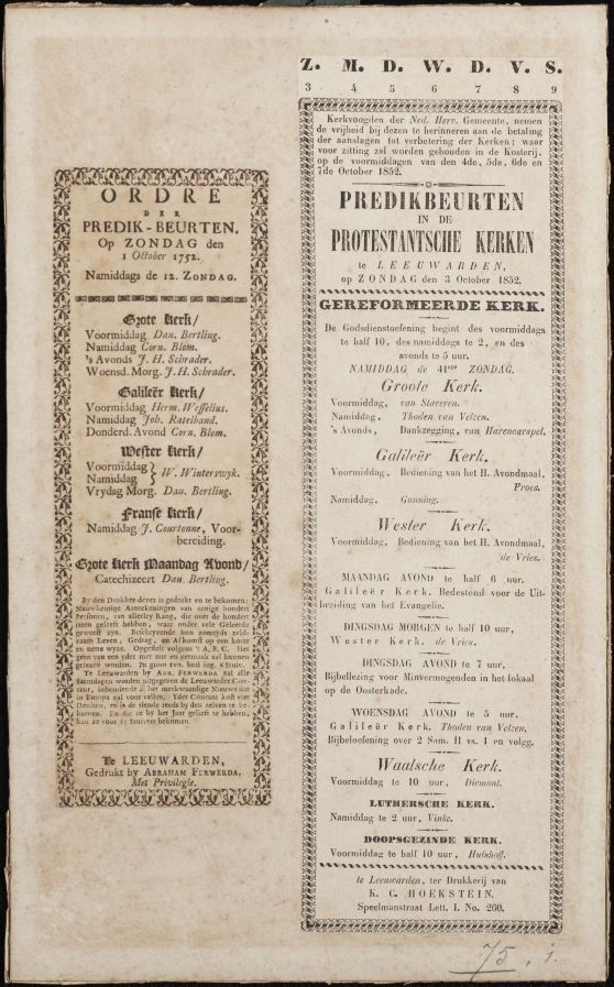 Ordre der predik-beurten op zondag den 1 October 1752; Predikbeurten in de Protestantsche kerken te Leeuwarden op zondag den 3 october 1852