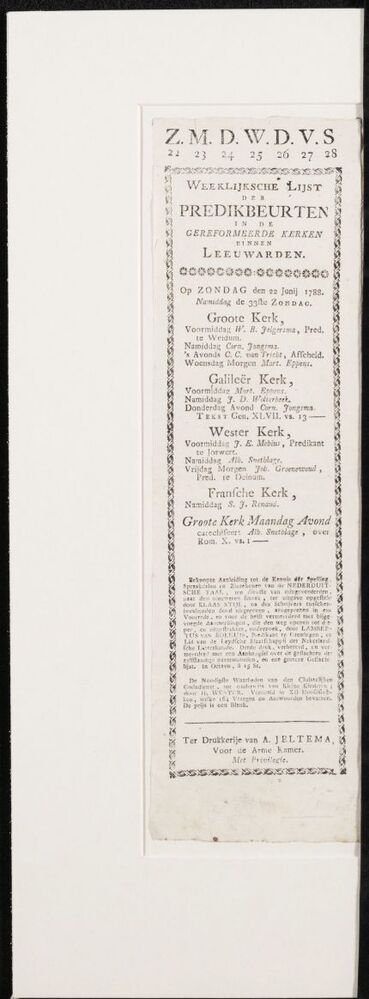 Predikbeurten in de gereformeerde kerken binnen Leeuwarden; zondag 22 junij 1788