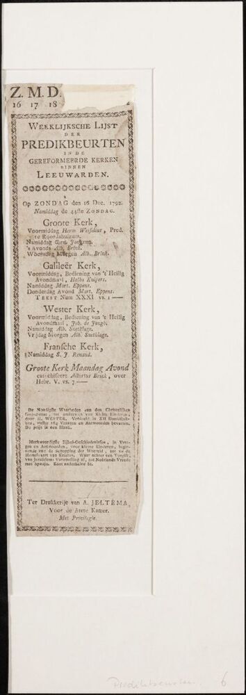 Predikbeurten in de gereformeerde kerken binnen Leeuwarden; zondag 16 december 1792