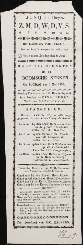 Orde der diensten in de Roomsche kerken op zondag den 6 mei 1830
