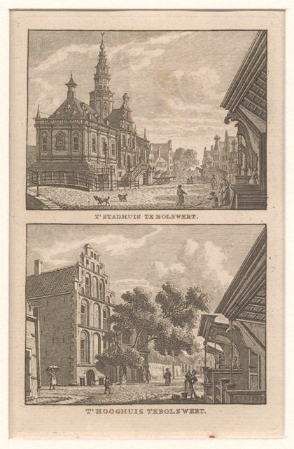 Gezicht op het stadhuis met gezicht op het Hooghuis te Bolsward