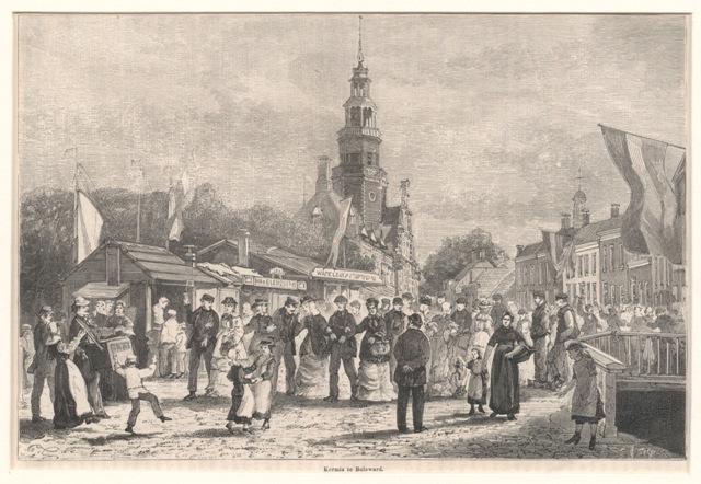 Gezicht op de kermis in de Voorstraat naar stadhuis gezien te Bolsward