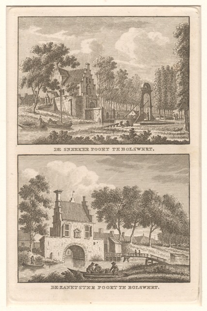Gezicht op de Sneekerpoort en op de Zanetsterpoort te Bolsward