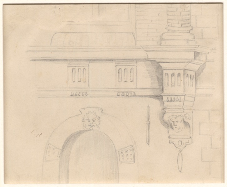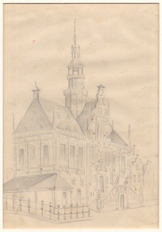 Verso: gezicht op het stadhuis te Bolsward, recto: bovenste deel van poort met bouwfragmenten daarboven, twee van vier tekeningen van het stadhuis van Bolsward