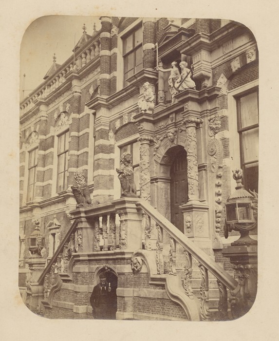 Stoep van stadhuis te Bolsward met man met iets in hand