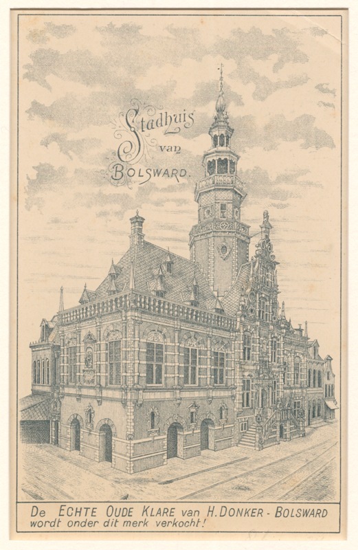 Gezicht op de voor- en zijgevel van het stadhuis te Bolsward
