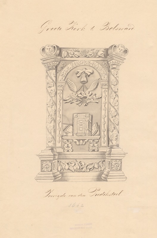 Gezicht op de voorzijde van de preekstoel in de kerk te Bolsward