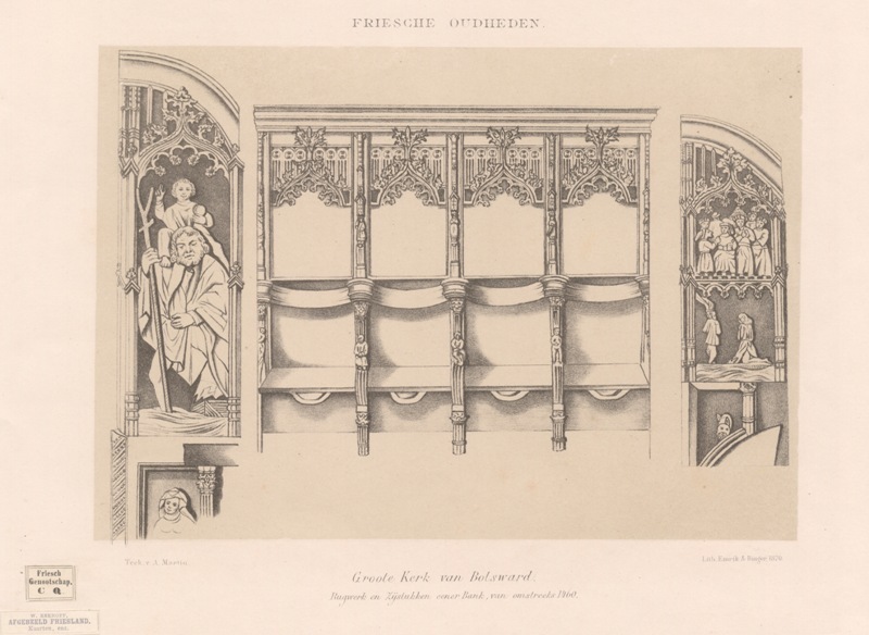 Gezicht op het rugwerk en zijstukken van een koorbank in de Grote Kerk te Bolsward