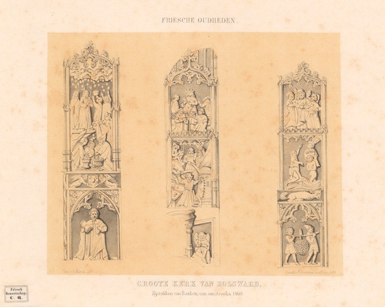 Gezicht op zijstukken van banken in de Grote Kerk te Bolsward