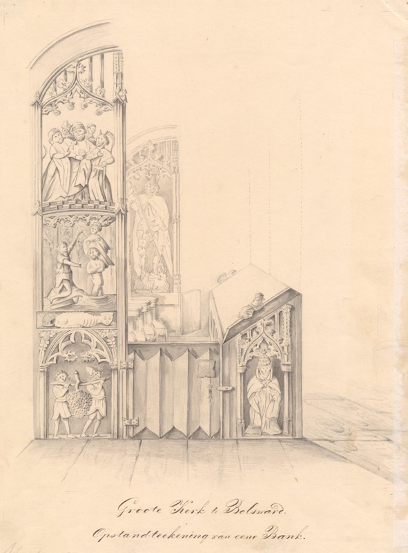 Gezicht op zijstukken van banken in de Groote Kerk te Bolsward