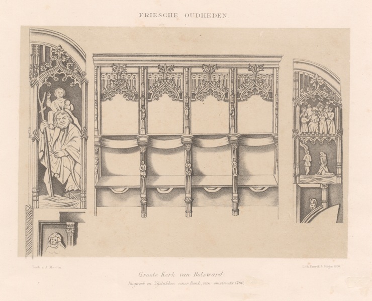 Gezicht op rugwerk en zijstukken van een bank in de Grote Kerk te Bolsward