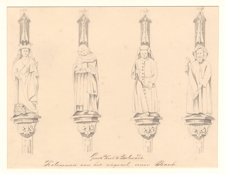 Gezicht op de kolommen van het rugwerk van een bank in de Grote Kerk te Bolsward