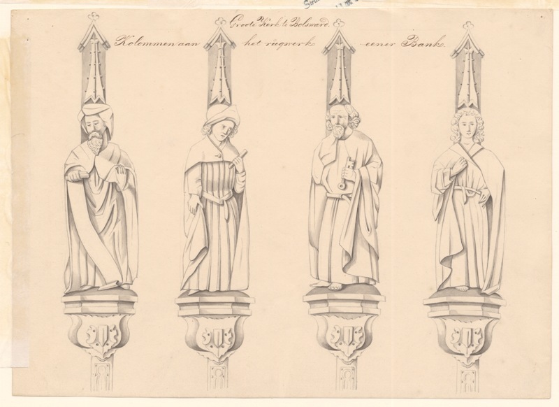 Gezicht op de kolommen van het rugwerk van een kerkbank te Bolsward