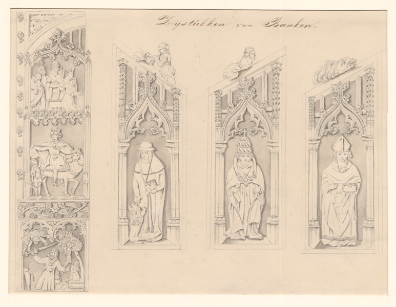 Gezicht op zijstukken van banken te Bolsward