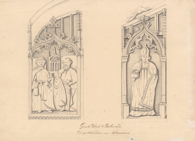 Gezicht op zijstukken van kerkbanken te Bolsward