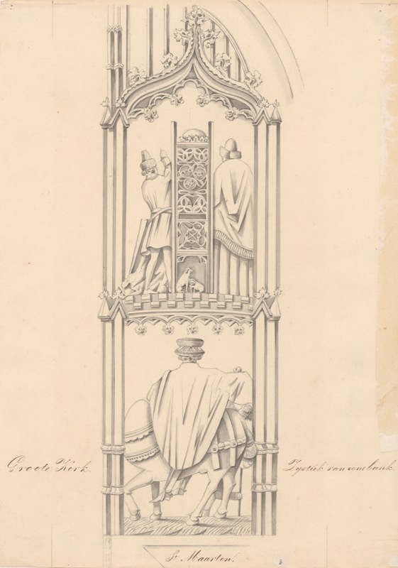Gezicht op een zijstuk van een kerkbank te Bolsward