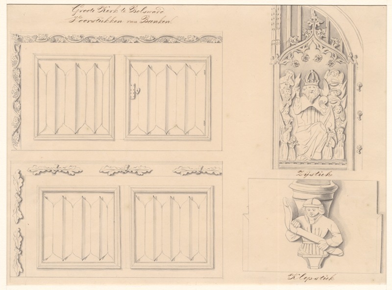 Gezicht op voor- zij- en klepstukken van een kerkbank te Bolsward