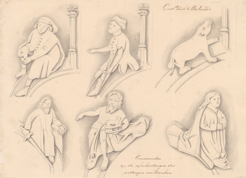 Gezicht op de ornamenten op de afscheidingen van de zittingen van kerkbanken te Bolsward
