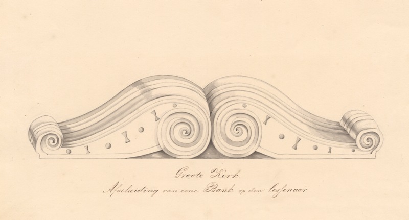 Gezicht op de afscheiding van een bank op de lessenaar in de Grote Kerk te Bolsward