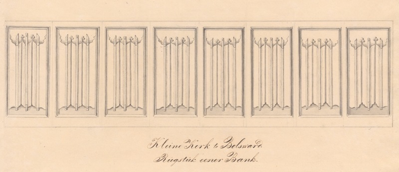 Gezicht op het rugstuk van een bank in de Kleine of Broerekerk te Bolsward